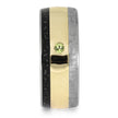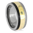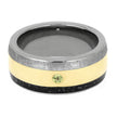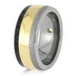 Embrace a sophisticated and enigmatic look with this meteorite and yellow gold wedding band. The central stripe of yellow gold is accented by a single peridot stone, adding a dash of color, while the inclusion of Stardust and Gibeon meteorite inlays lends a distinctive and celestial touch to the design.