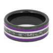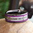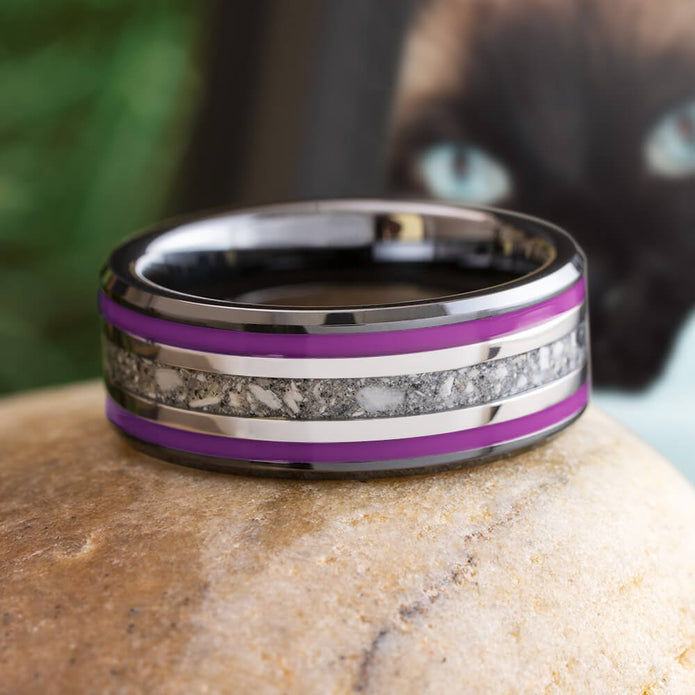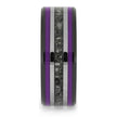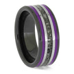 This custom-made ring in black ceramic is a thoughtful tribute to a cherished pet, loved one, or friend. It showcases three distinct inlays, separated by two titanium pinstripes, with vibrant purple enamel on the outer sections and a section for ashes or cremains in the center.