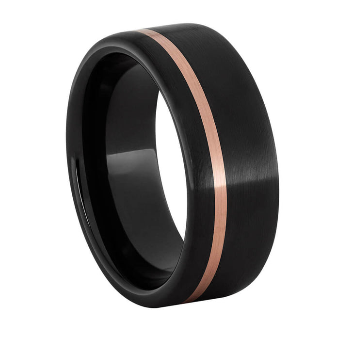 A sleek matte finish and rose gold pinstripe decorate this black ceramic wedding band for a sleek, modern look. This black wedding band is perfect for anyone who wants a minimalist style yet also wants to match their partner's rose gold ring.