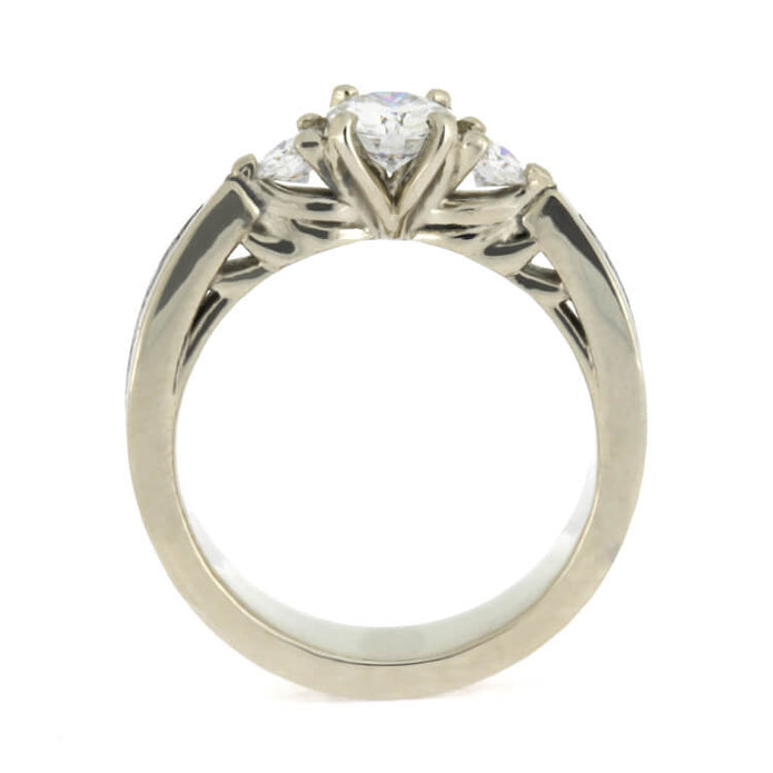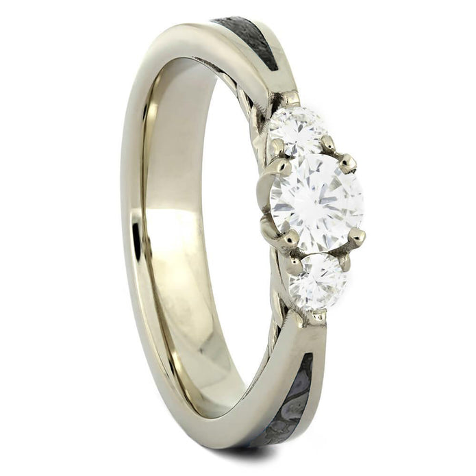 A floral setting adds a natural twist to this three stone 14k white gold engagement ring. Set in gold, the three moissanite stones are bordered by twin inlays of dinosaur bone, symbolizing the longevity of your bond. This fossil jewelry is the perfect wedding ring for anyone who appreciates science.