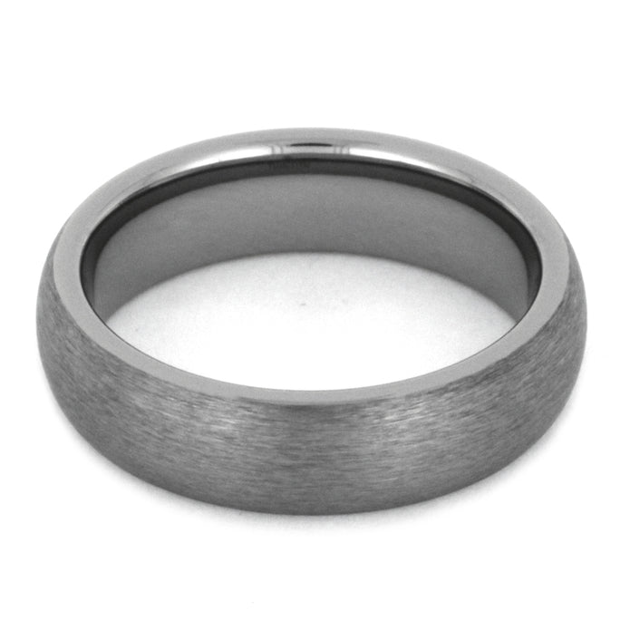 Here is a simple and masculine tungsten wedding band. The durable tungsten exterior is equipped with a subtle matte finish, while the interior has a polished shine.