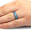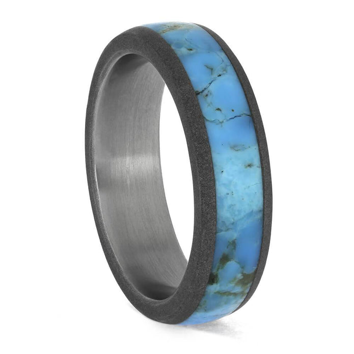 A Southwest style and subdued minimalism combine on this unique turquoise ring from Jewelry by Johan. Choose a colorful yet simple design with this turquoise wedding band featuring sandblasted titanium. The inclusion of Arizona Kingman turquoise beautifully complements the titanium's minimalist sandblasted finish.