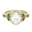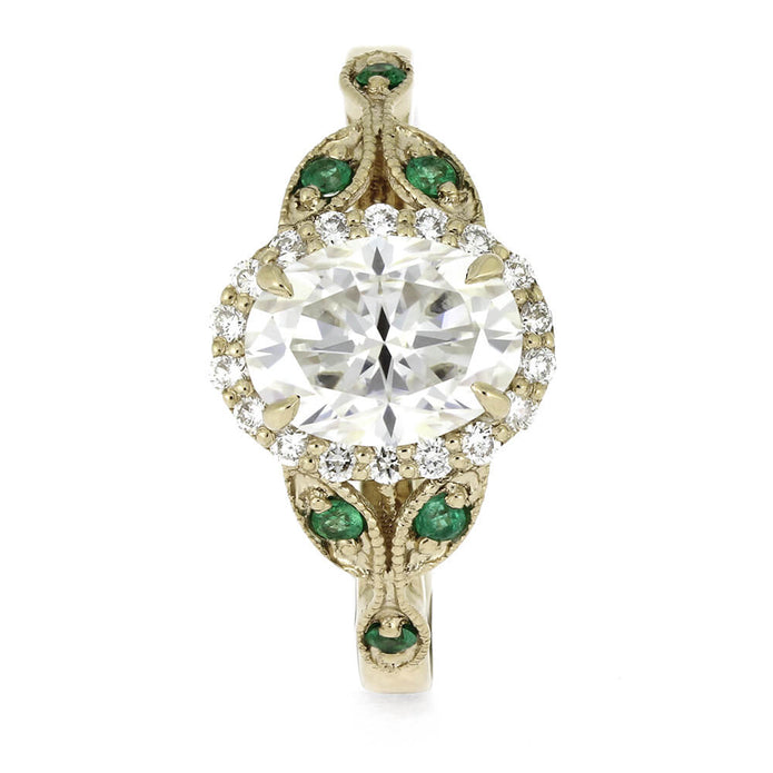 Pop the big question this vintage-style engagement ring in white gold. It features an oval moissanite stone surrounded by a halo of diamonds, emerald accent stones, and fine millgrain edges. Make it truly personalized by selecting different stones or modifying design elements for a one-of-a-kind piece.