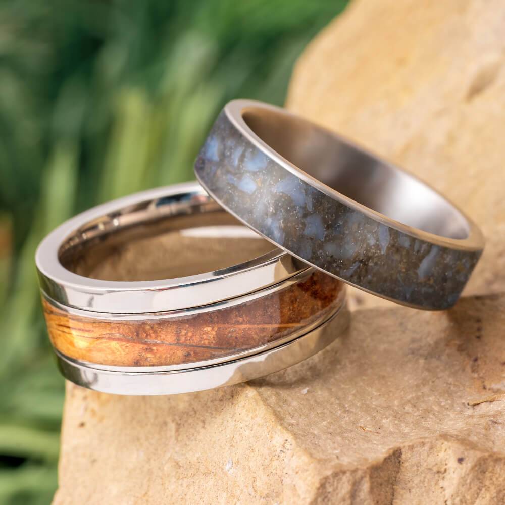 Whiskey Barrel Oak & Dinosaur Bone Modular Titanium Ring Set