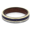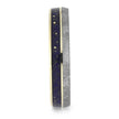 This elegant wedding band boasts a perfect blending of blue tones and white gold. The stunning Gibeon meteorite is juxtaposed with the naturally stunning lapis lazuli inlay. Its sleek design is elevated by a bloodwood sleeve for optimal comfort and a flawless fit.