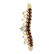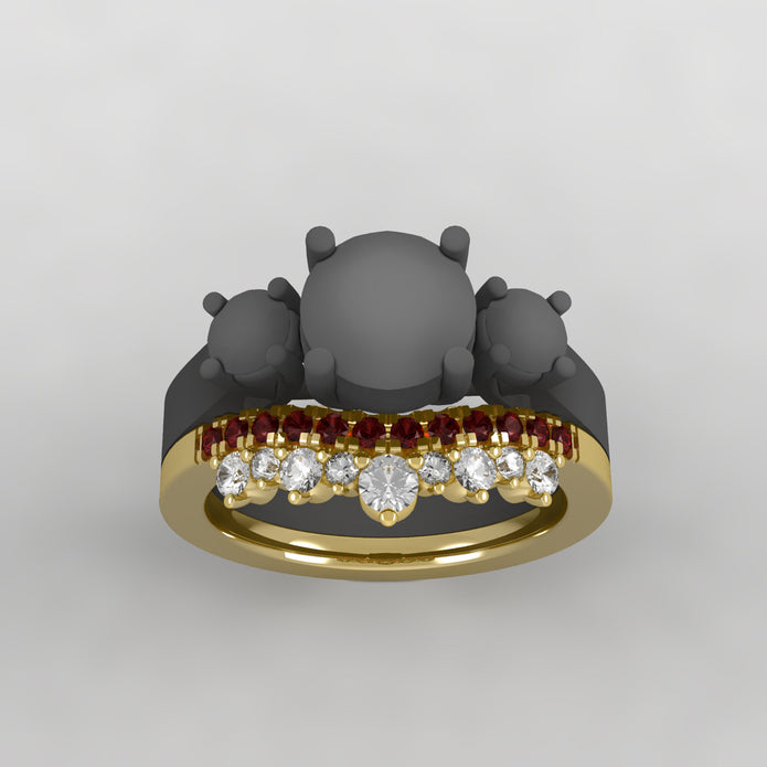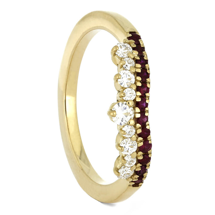 This ruby wedding band can be customized to fit perfectly against your engagement ring. The rubies travel along the top of the band while the moissanites dangle off the edge similar to yellow gold leaves. This design pairs perfectly with a single or three-stone engagement ring design.