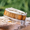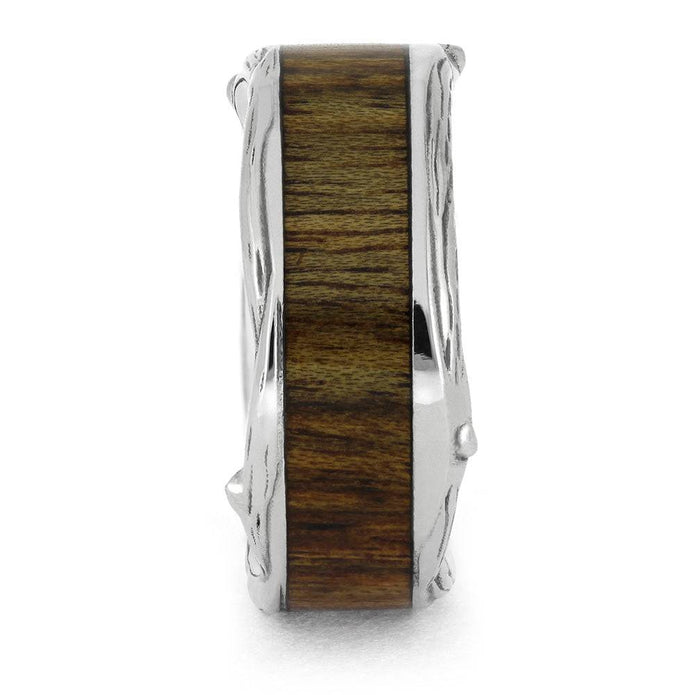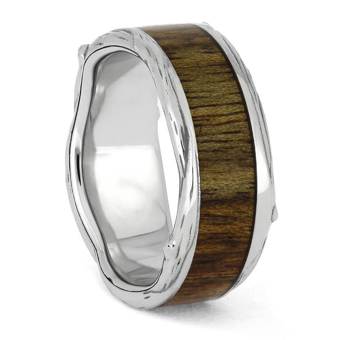 Capture the beauty of the outdoors with this one-of-a-kind nature wedding band. Handcrafted with a branch-like profile and waterproofed Caribbean rosewood, this organic-style ring is perfect for outdoor lovers, symbolizing the eternal promise of your union.