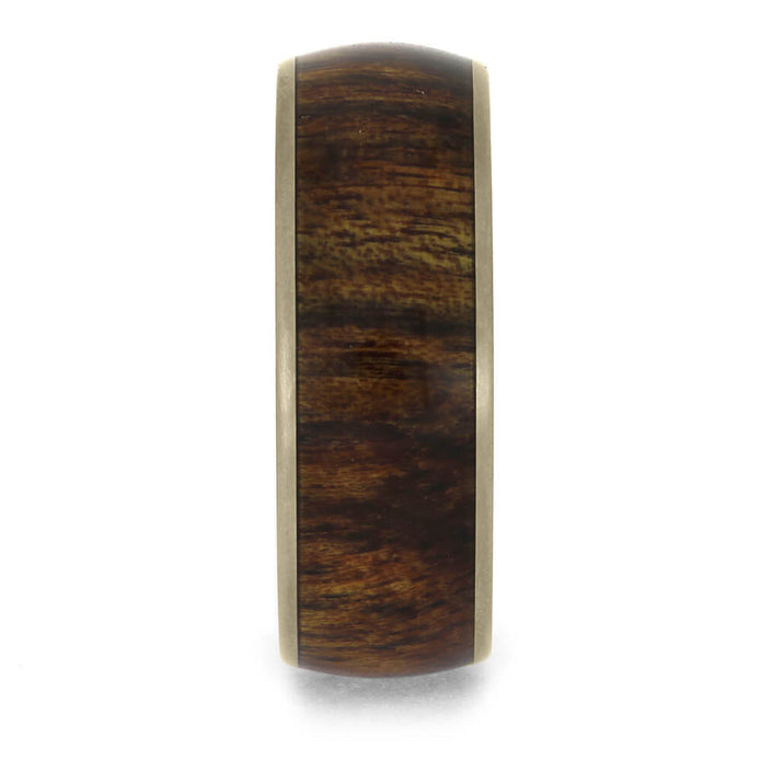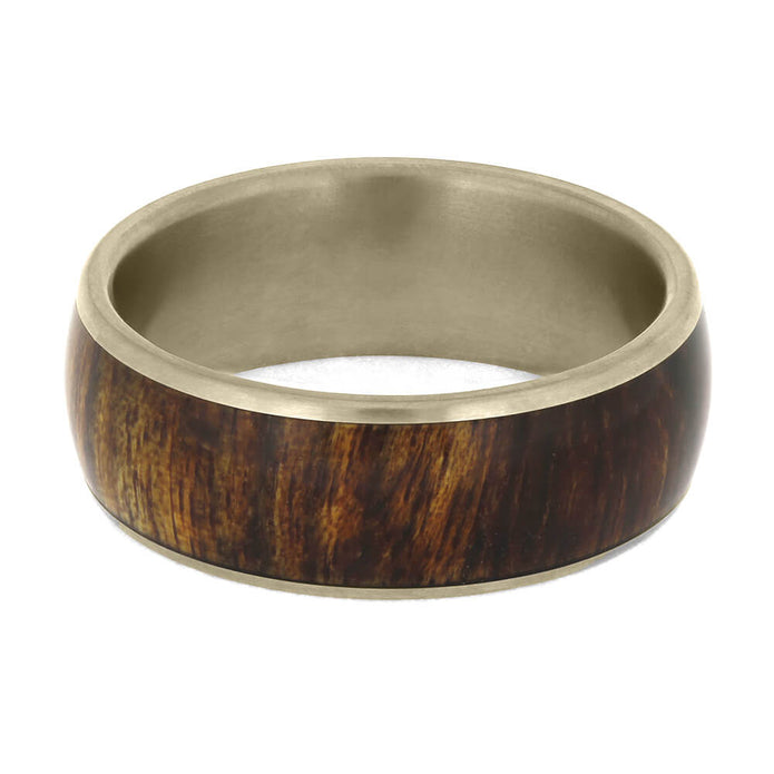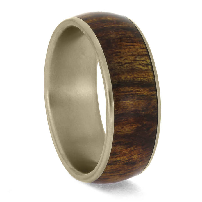 Expertly crafted, this stylish wedding band blends 14k white gold with exotic Caribbean rosewood, evoking a natural and rustic aesthetic. The subdued yet sophisticated matte finish is perfect for nature lovers and outdoor enthusiasts.