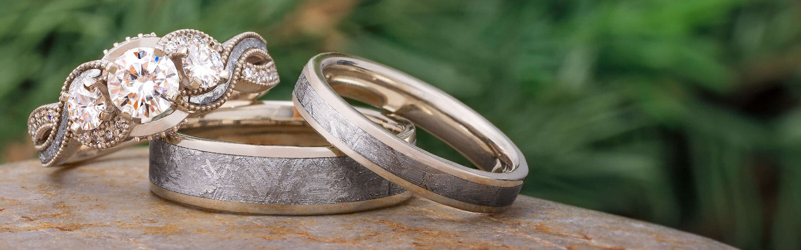 White gold is a popular element for our white jewelry; keep in mind that all of our gold rings can have the gold color changed to white in 10k, 14k or 18k, if desired! All of our stardust rings feature authentic meteorite shavings in colored enamel, including white.