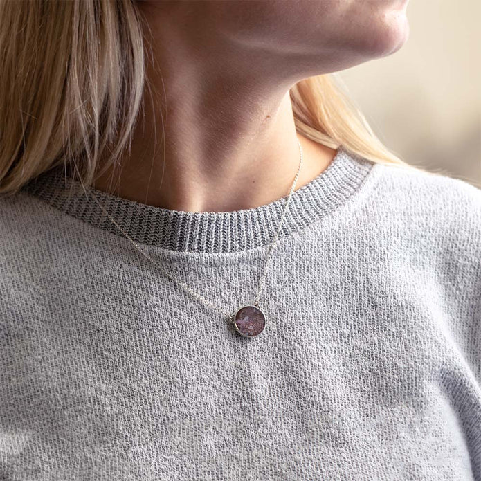 This necklace features a dinosaur bone fossil in a sleek bezel, slightly larger than a dime. The polished metal back is ideal for custom engravings, making it a unique and thoughtful present for any occasion such as birthdays, anniversaries, graduations, or everyday wear. Wear a piece of real dinosaur bone today!