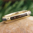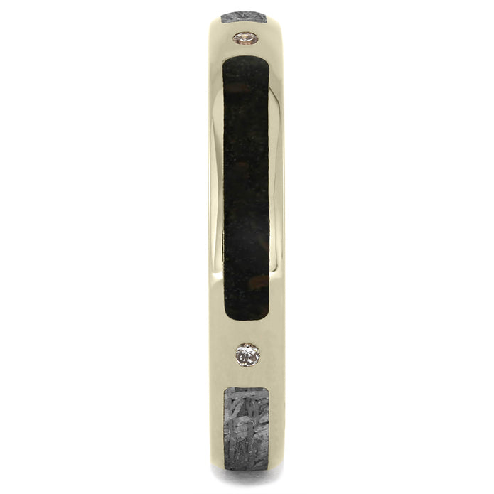 Here is a masterful, dainty diamond ring for women with some magnificent materials. A small strip of dinosaur bone sits between the two dazzling diamonds. Along with the Jurassic beauty is amazing Gibeon Meteorite. The meteorite’s Widmanstätten pattern is appreciated for its beauty both by collectors and designers of jewelry.
