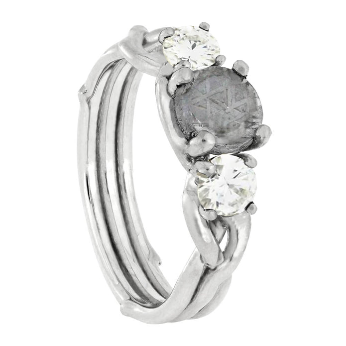 Handcrafted with a unique triple band design, this meteorite engagement ring is out of this world. Two white sapphire stones adorn each side of the meteorite for a nontraditional take on the three stone setting. The meteorite stone features an amazing Widmanstätten pattern, this pattern is unique in meteorites and no two pieces will ever look the same.