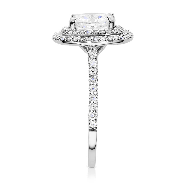 Halo engagement rings feature a center stone surrounded by a continuous band of smaller accent stones, which add to the size and sparkle of the overall setting. Like all of our custom engagement rings, halo designs are available in a variety of precious metals, including rose gold, white gold, yellow gold, and platinum. The eye-catching center stone arrangement of a halo engagement ring pairs beautifully with our unique inlay materials, such as Gibeon meteorite or deer antler!