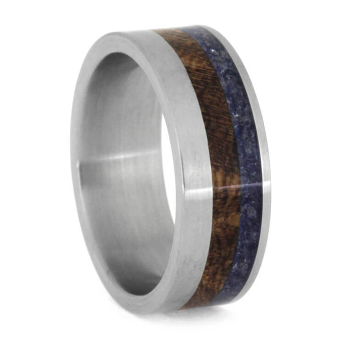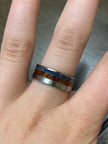 This blue sea glass wedding band is crafted with mesquite burl wood. This titanium ring is the perfect nostalgia ring to reminisce about that one perfect vacation you went on.