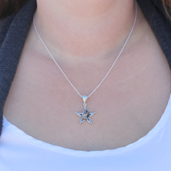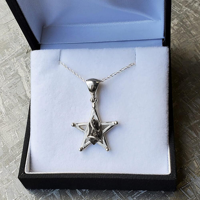 This unique necklace is made with sterling silver and has a nugget of Campo del Cielo meteorite in the center of the star pendant. Each piece of meteorite is unique in shape and size. This stunning pendant necklace has a sleek polished finish and lobster clasp chain.