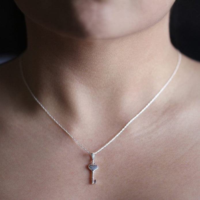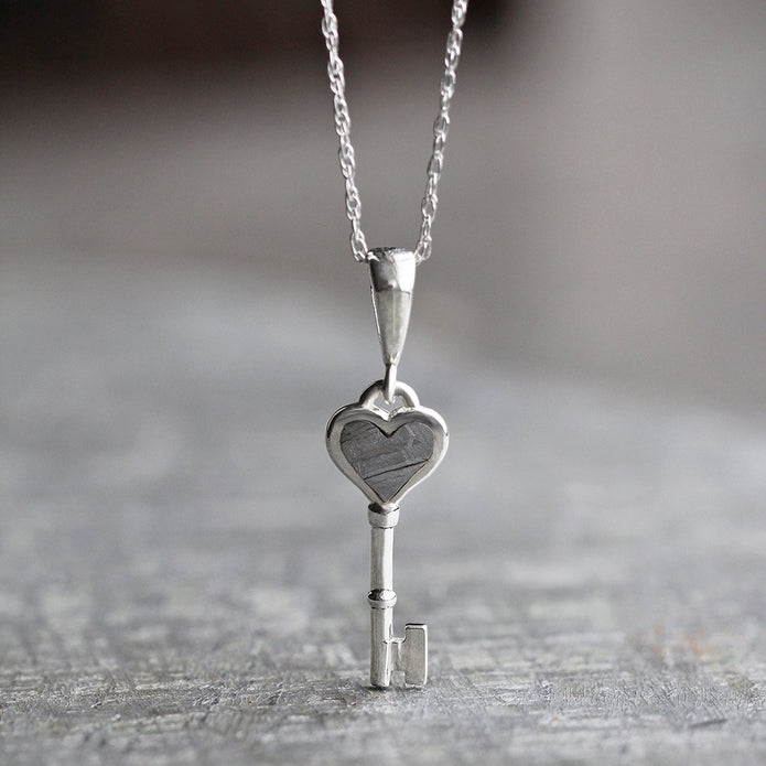 Gift this sterling silver meteorite key pendant necklace for that special person in your life who holds the key to your heart. This unique key necklace charm has a tiny, genuine meteorite heart inlay.
