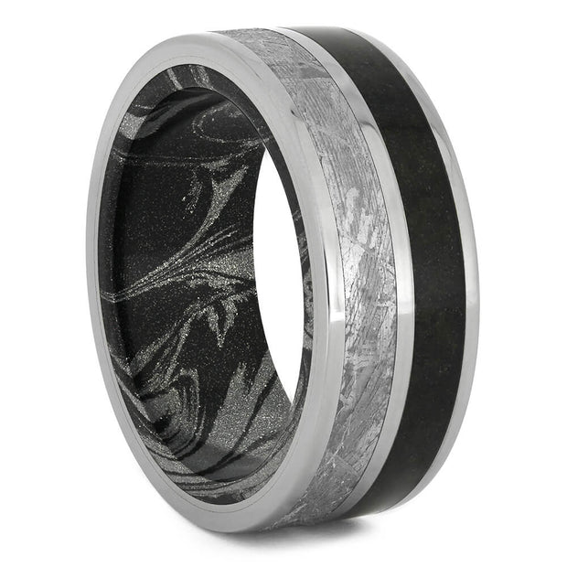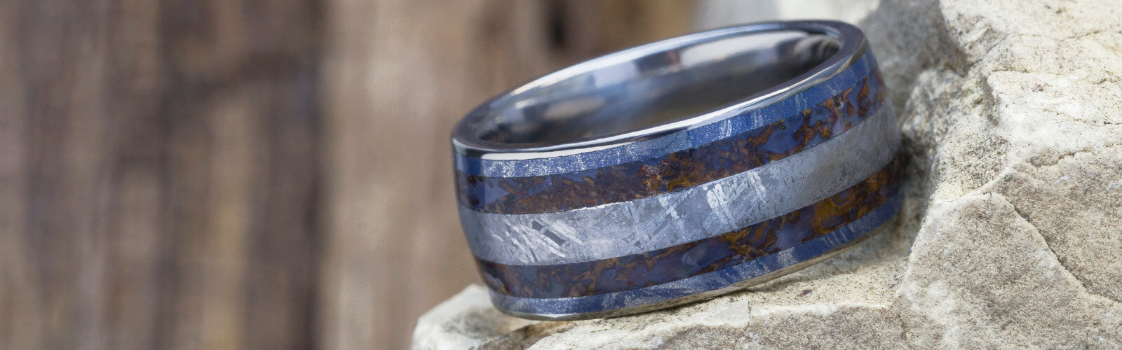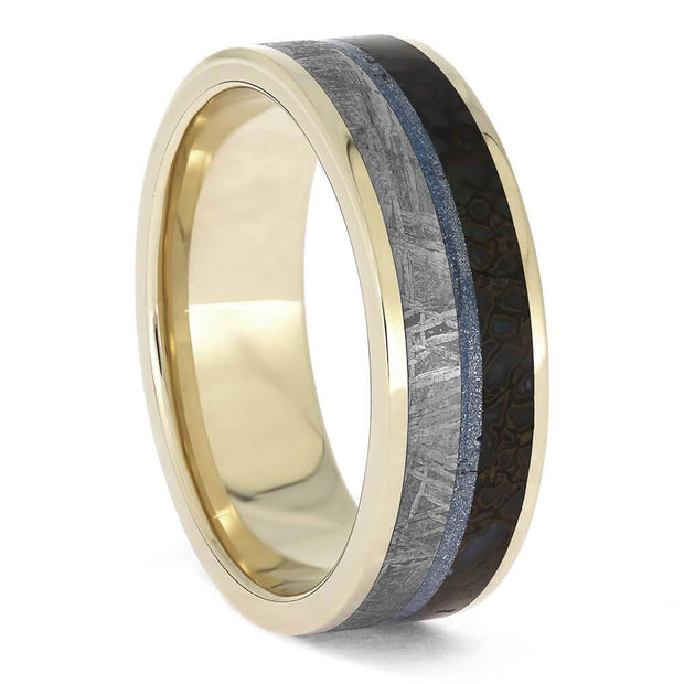 Our mokume gane rings show off genuine dinosaur bone inlays. Natural dinosaur bone wedding bands get even more classy with the mysterious colors and swirls of Japanese mokume rings. Make a statement of your individual style with these mokume gane wedding bands. Our mokume gane options run the gamut and feature a variety of color combinations.
