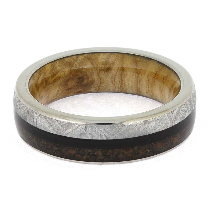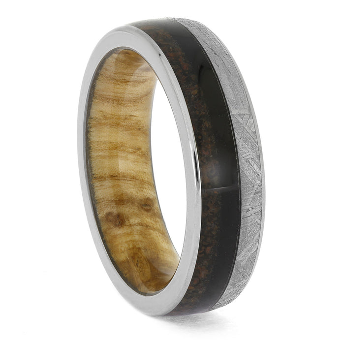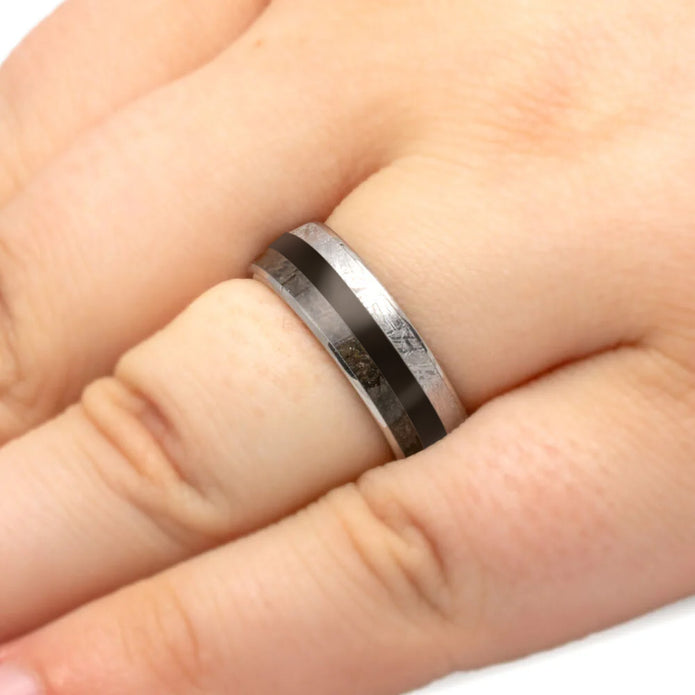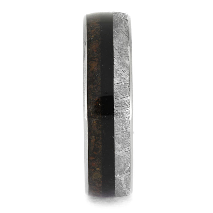Nature and celestial elements combine to create a bold and masculine look on this meteorite, wood, and dinosaur bone wedding band. Crafted from titanium, this men's ring features two distinct hardwoods for a striking contrast. Display your appreciation for the natural world with this one-of-a-kind titanium wedding band.