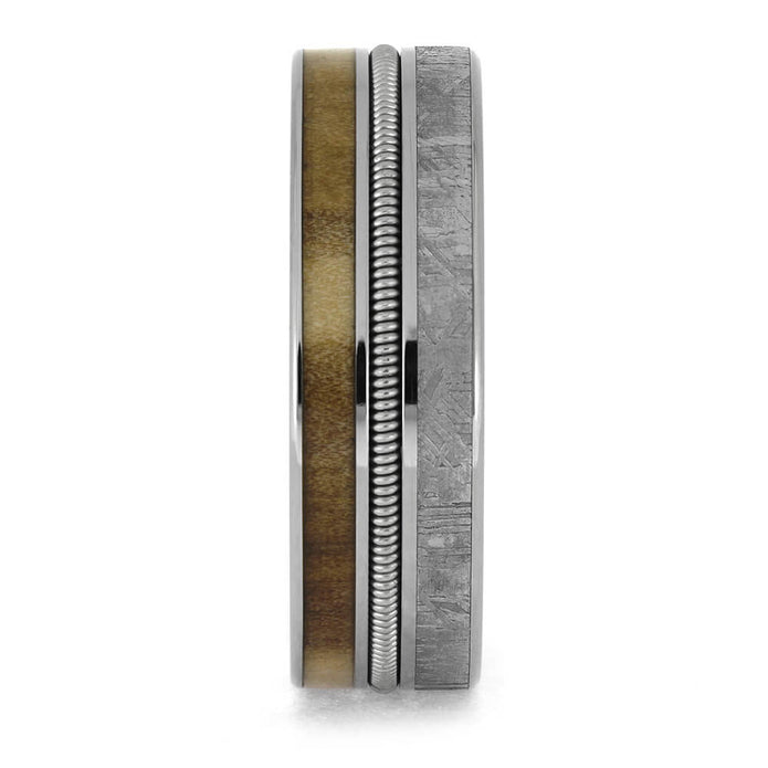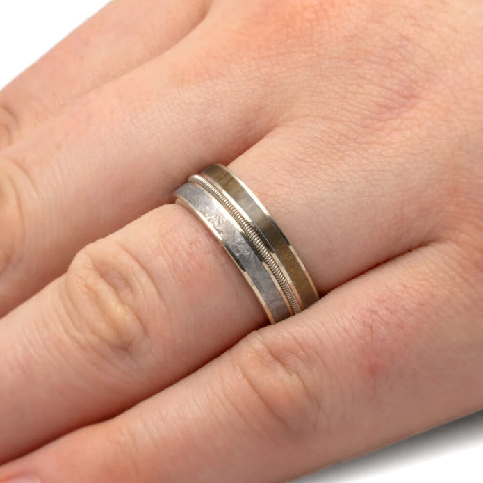 Your wedding band deserves a personal touch. Send us a string from your favorite bass and I will incorporate it in your very own guitar ring. Rowan wood, which is a popular wood choice for making instruments, will accompany the string alongside genuine Gibeon meteorite.
