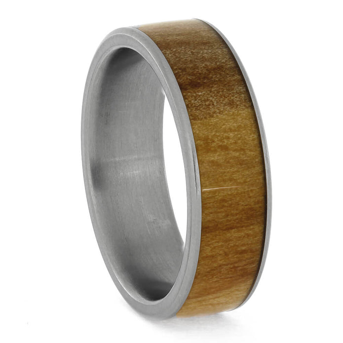 When rowan wood is carefully inlaid on a matte-finished titanium sleeve, the result is magical. This natural wood ring makes an attractive wedding band that can be worn by men or women.