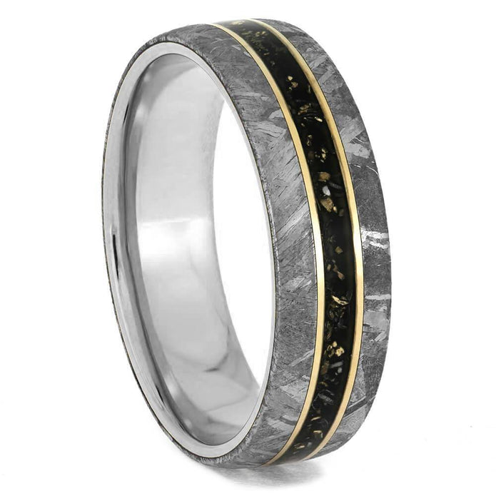 Materials in Titanium Ring With Meteorite, Black Stardust & Gold Pinstripes