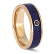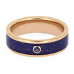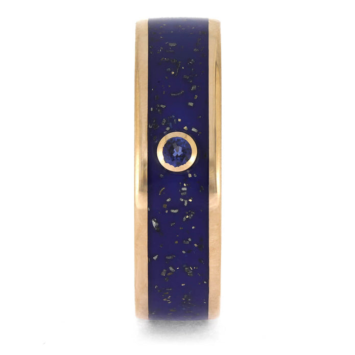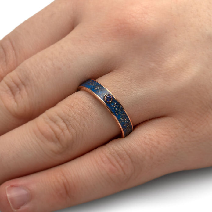 Gold flakes and meteorite shavings glisten in this blue Stardust™ sapphire ring. Accented with a sparkling blue sapphire, this vivid blue wedding band is sure to turn heads. The polished 14k rose gold borders and sleeve complement the star-crossed inlay and stone for a truly stellar aesthetic.