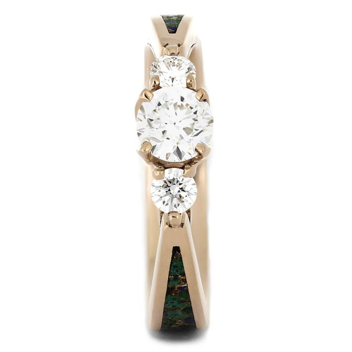 Transform the traditional three stone diamond design with turquoise and solid 14k rose gold. Diamonds are always elevated by color, and this gold ring embraces that wholeheartedly with desert mosaic turquoise, one of our exclusive gem alloy materials, which has a beautiful mix of green and blue.