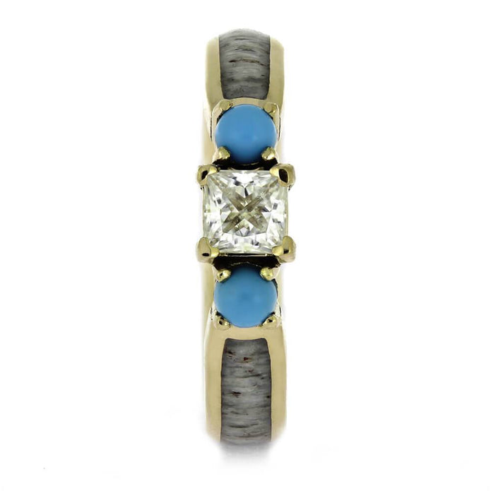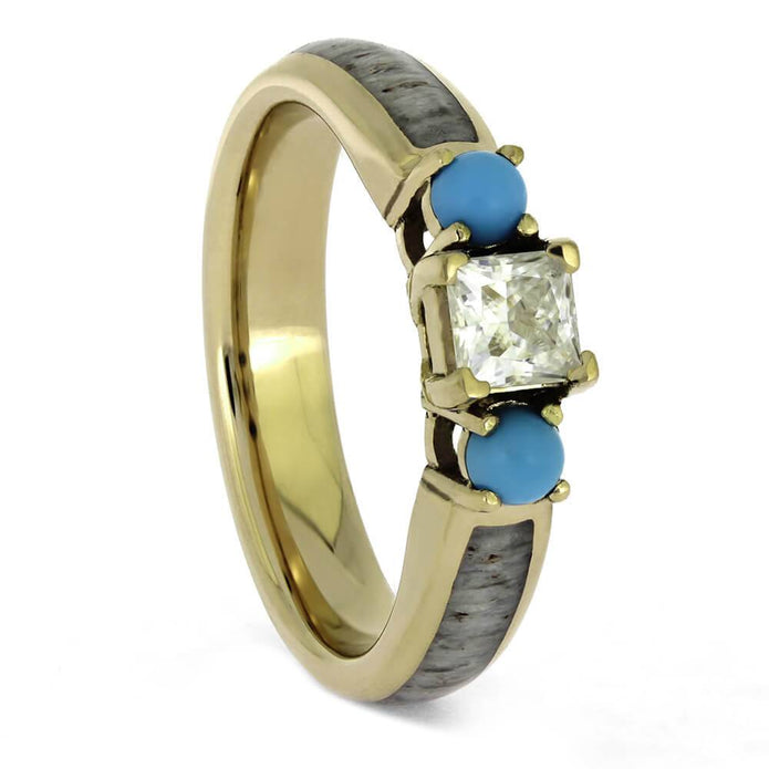 This engagement ring features a sparkling diamond complemented by two cabochon turquoise gemstones of a vibrant blue hue. The 14k yellow gold band is adorned with naturally shed antler, showcasing its beautiful and unique color.