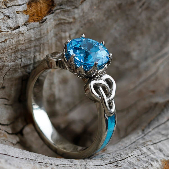 Diamonds, Kingman blue turquoise, and a pair of solid 14k white gold Celtic knot designs adorn this colorful topaz engagement ring. The eye-catching lotus setting hosts a genuine Swiss blue topaz, which matches the turquoise inlays and compliments the diamond side stones.