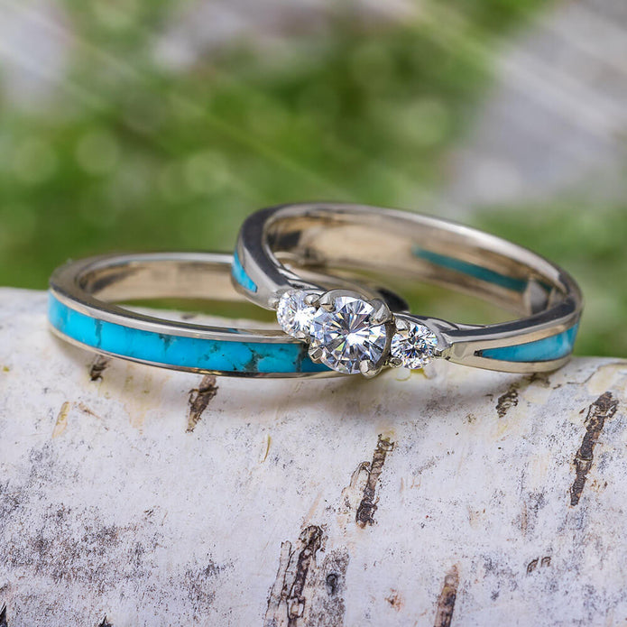 Two handcrafted turquoise rings are paired together for a bright and beautiful blue turquoise bridal set. The three stone moissanite engagement ring has partial turquoise inlays on each side of the 14k white gold shank, while the band has turquoise that goes all the way around the ring.