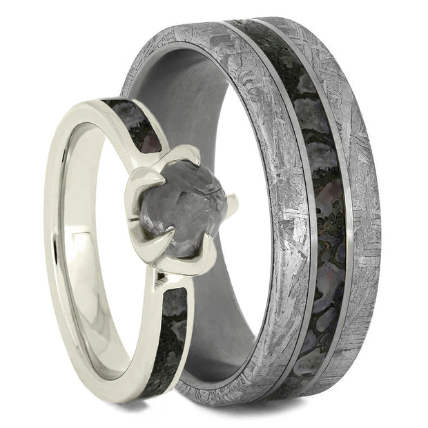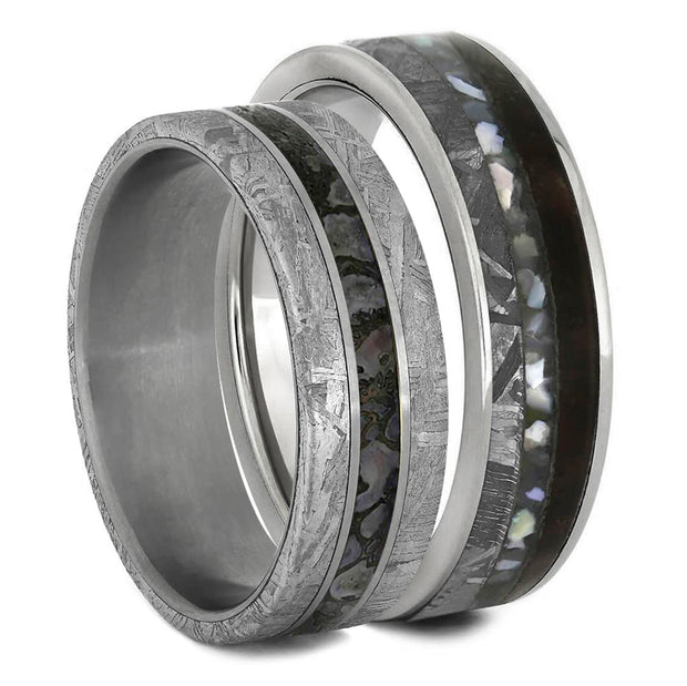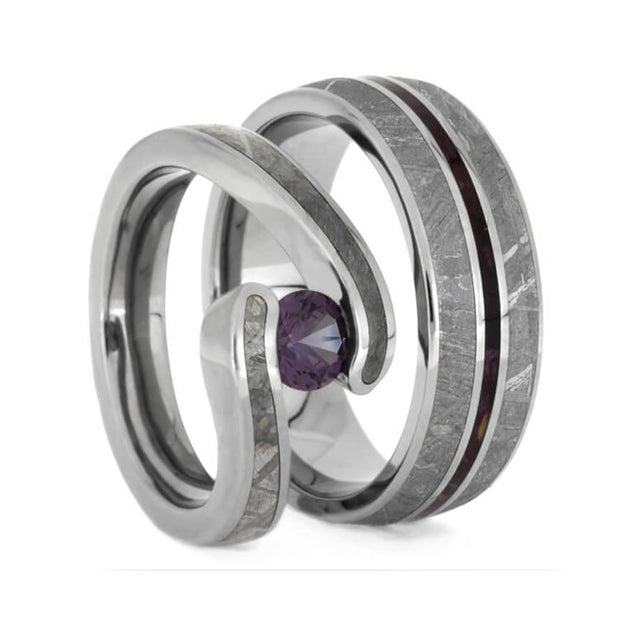 Discover unique matching wedding ring sets, each handmade by Jewelry by Johan with rare materials like meteorite, wood, and antler. Every set features one-of-a-kind designs and can be customized for a personal touch.