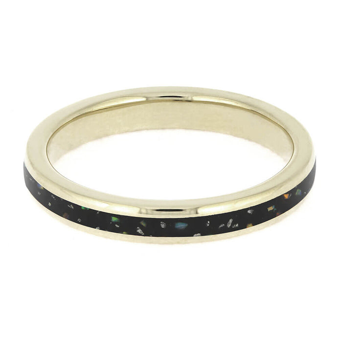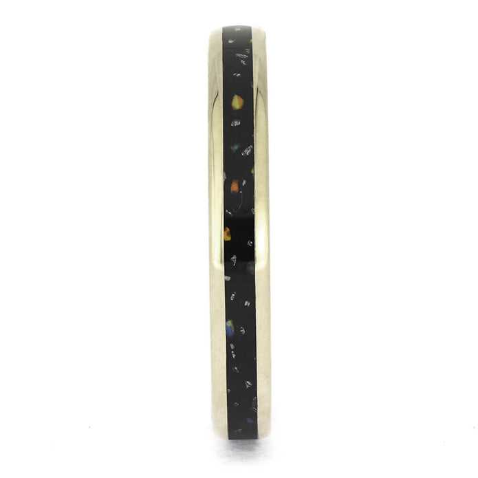 This 3mm wedding band for women is expertly crafted from 14k white gold, resulting in a smooth and polished finish. Combining both traditional and modern aspects, this ring is the perfect choice for your special day. The stunning design features black Stardust meteorite shavings and synthetic opal accents, creating a unique and eye-catching look.