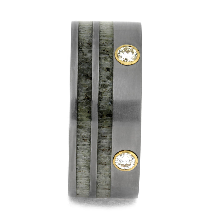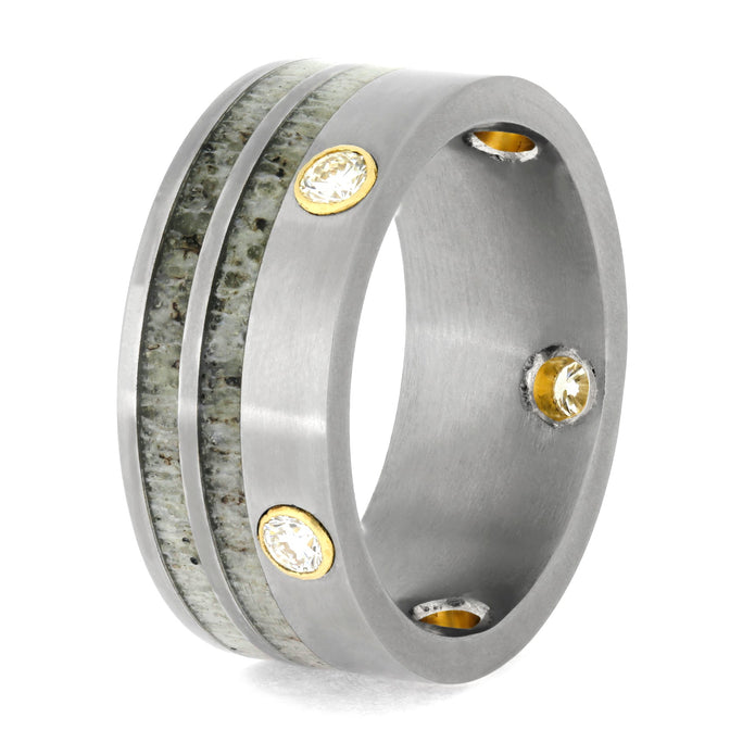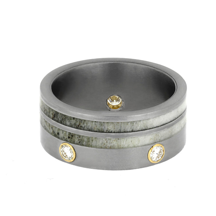 Deer antler ring with titanium and five stunning diamonds encircled by a yellow gold bezel setting. This diamond ring can be made using your own antler for no additional cost!