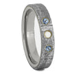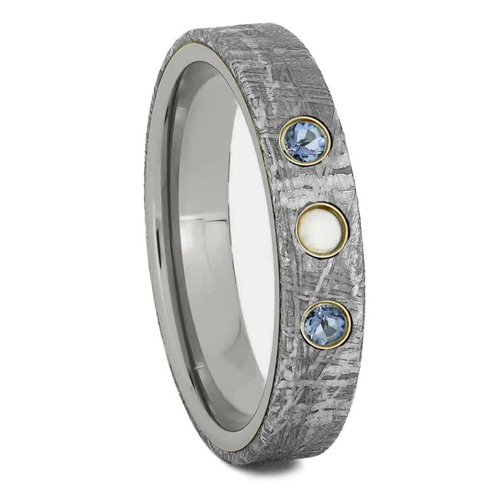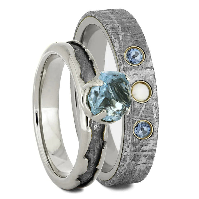 A handmade gemstone wedding ring set for him and her. This set comes with a rough aquamarine engagement ring with a 14k white gold wavy ring design inlaid with meteorite. The meteorite titanium wedding band has two aquamarine gemstones surrounding the opal, bezel set in 14k white gold.