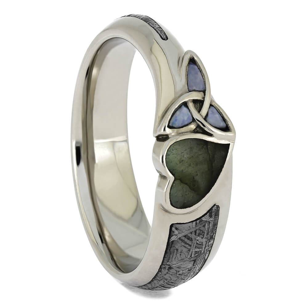 It would be difficult to find another labradorite ring with a design as creative and unique as this one! A fantastic meteorite inlay curls around the sleek 10k white gold band. Of course the stars of the engagement ring are the wonderful fashioned heart and trinity knot, made with labradorite and opal respectively.
