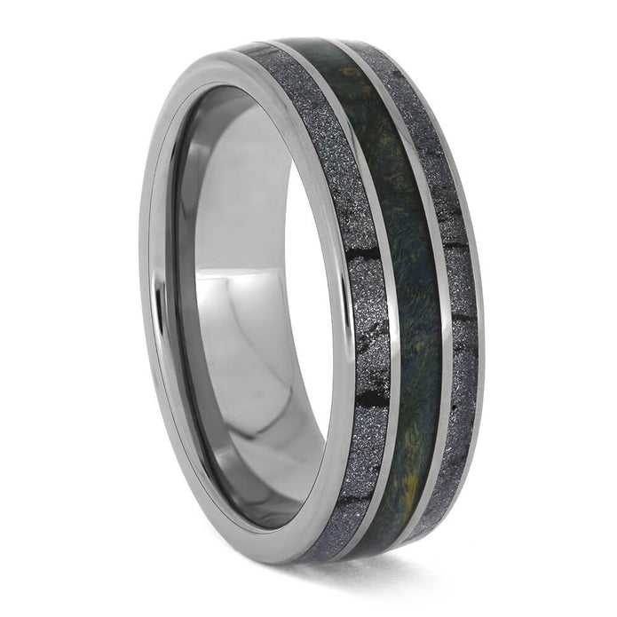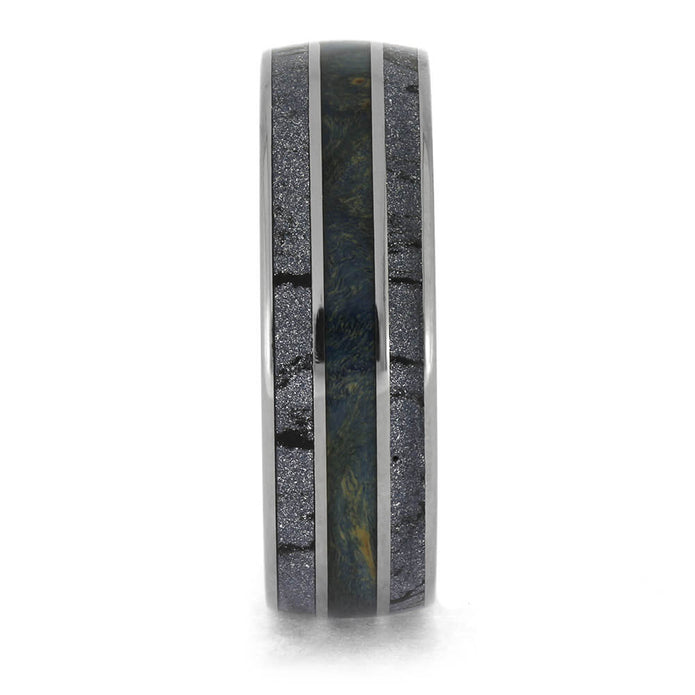 If your future groom loves the color blue, and is looking for a non-traditional symbol of your union, this unique men's wedding band could be just what they're looking for. Swirling, composite mokume gane and beautiful, blue box elder burl wood pair perfectly in this high-quality, handcrafted ring.