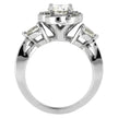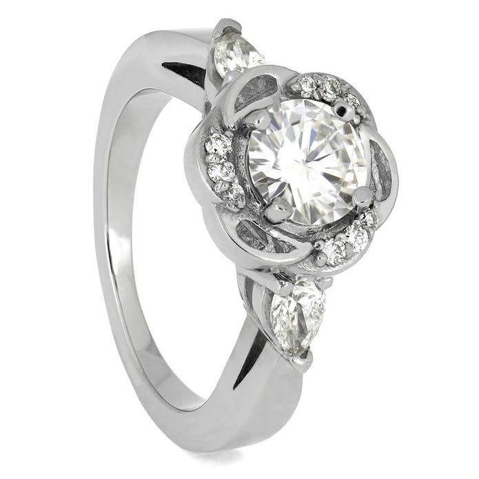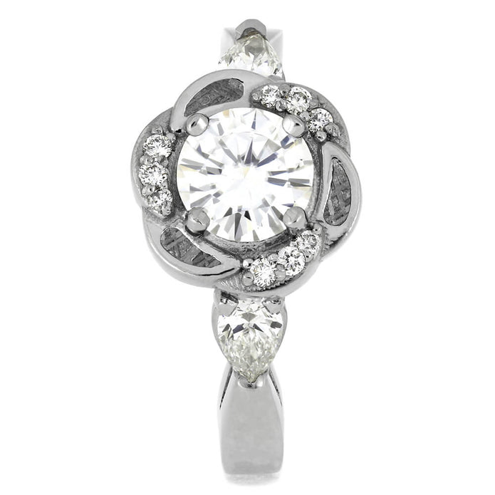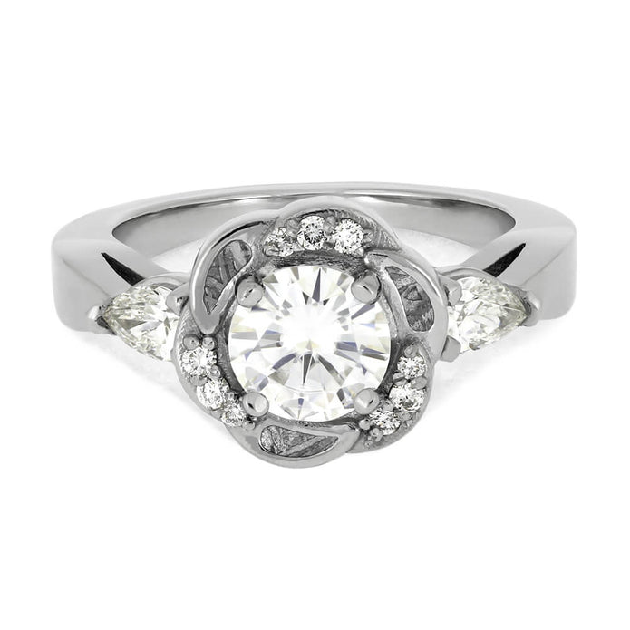 Meteorite petals surround the moissanite center stone in platinum engagement ring. Sparkling diamonds dance like stars in a partial halo design, alternating with inlays of genuine Gibeon meteorite. She's sure to say I do when you propose to her with this dazzling, space-themed engagement ring!