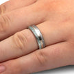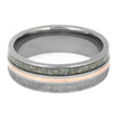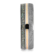 This titanium ring boasts a stunning combination of synthetic opal and authentic Gibeon meteorite, accentuated by a sleek 14k rose gold pinstripe. Its polished finish adds just the right touch of shimmer to this birthstone ring, perfect for those born in October.