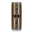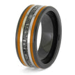 Crafted from durable black ceramic, this personalized ring honors the memory of a beloved pet, companion, or dear friend. It boasts three unique inlays, each framed by sleek titanium pinstripes, while fiery orange enamel adorns the outer portions and a special compartment in the center holds ashes or cremains.