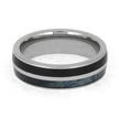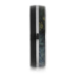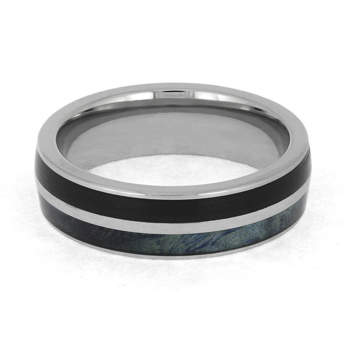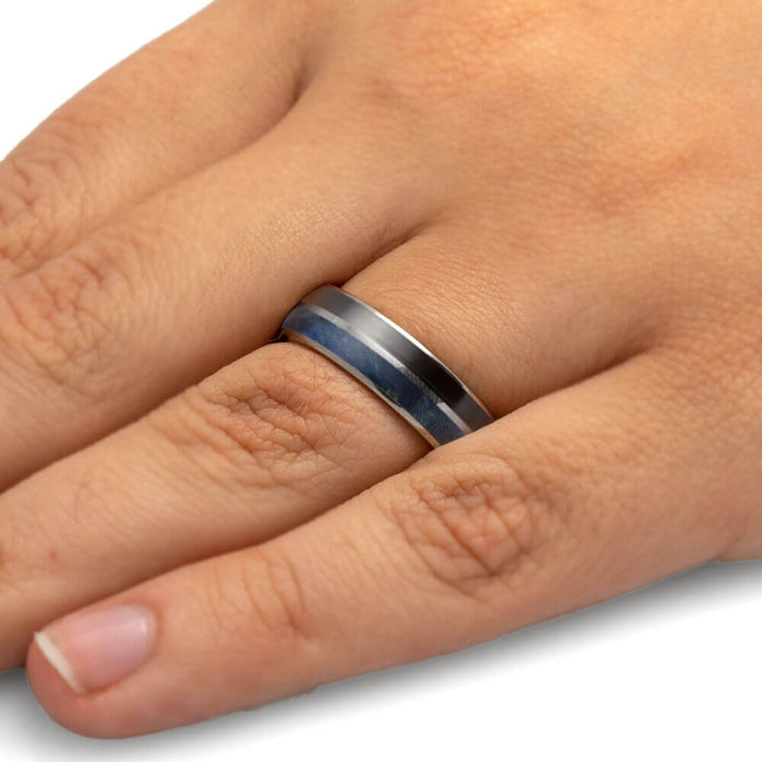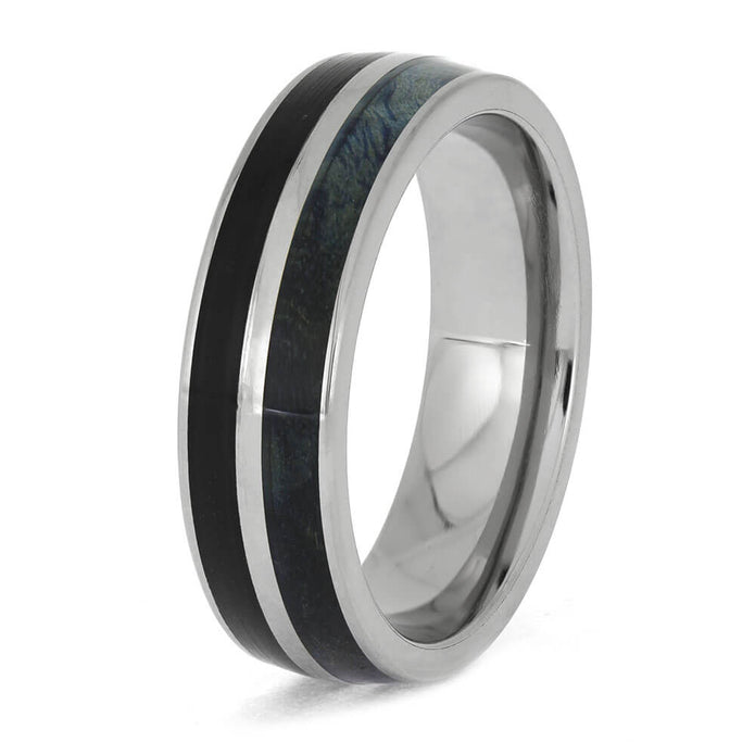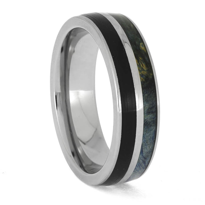 This distinctive men's wedding band features a vinyl record inlay that contrasts elegantly with polished titanium edges. The ring's sleek design combines blue box elder burl wood and a dark vinyl record inlay, giving it a modern and stylish appearance. It's the perfect ring for music enthusiasts and those looking for a unique and fashionable wedding band.