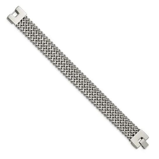 This unisex bracelet is a real statement piece, featuring a delicate weave pattern in stainless steel and measuring at 16 mm in width!