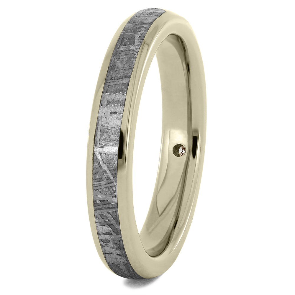 Here is a masterful, dainty diamond ring for women with some magnificent materials. A small strip of dinosaur bone sits between the two dazzling diamonds. Along with the Jurassic beauty is amazing Gibeon Meteorite. The meteorite’s Widmanstätten pattern is appreciated for its beauty both by collectors and designers of jewelry.