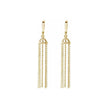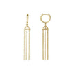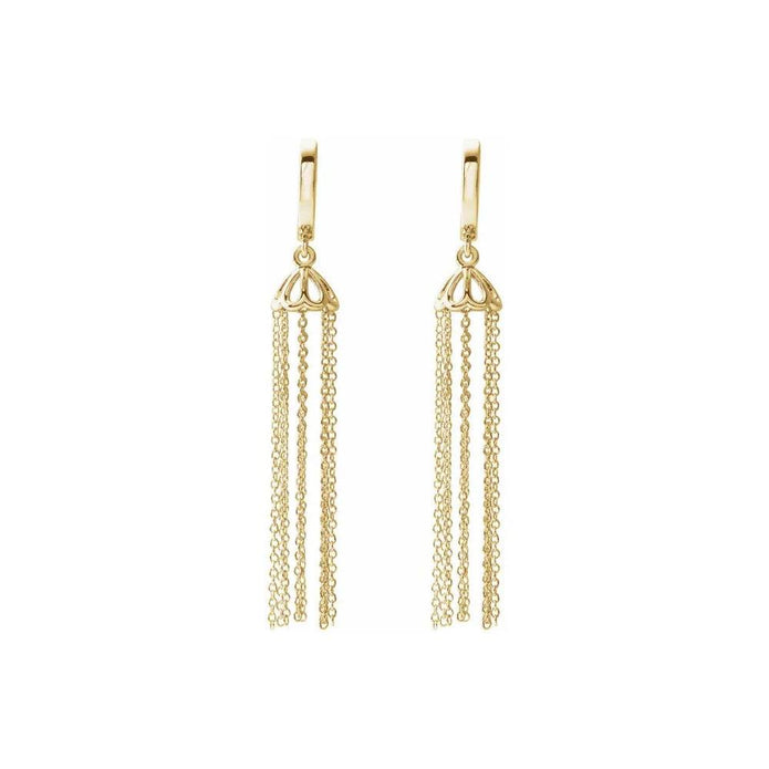 These stunning dangle earrings feature dangling gold chains with a floral top accent. The tiny hoop on the top has a hinged closure. Crafted in perfectly polished 14k yellow gold.