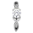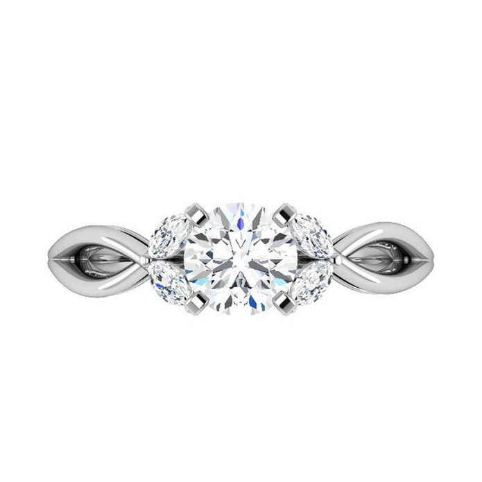 This white gold engagement ring features a gorgeous, round cut moissanite in a 4-prong setting. Marquise cut diamond accent stones provide a symmetrical frame that resembles sparkling leaves.