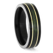 This exceptional wedding band is crafted from titanium with an African blackwood sleeve and inlay, a jade inlay and yellow gold pinstripes for a unique finish. This timeless design is the perfect way to celebrate your union.