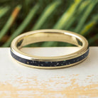This 3mm wedding band for women is expertly crafted from 14k white gold, resulting in a smooth and polished finish. Combining both traditional and modern aspects, this ring is the perfect choice for your special day. The stunning design features black Stardust meteorite shavings and synthetic opal accents, creating a unique and eye-catching look.