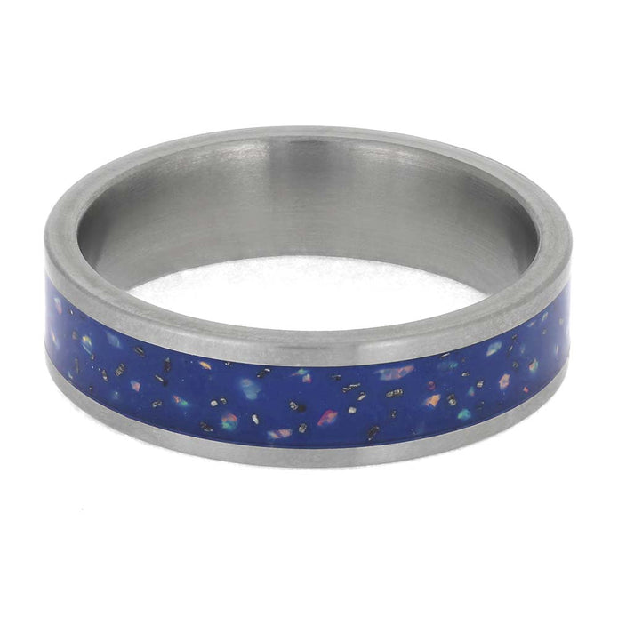 Wear a real piece of the stars with this colorful blue opal Stardust wedding band! This ring is inlaid with meteorite shavings and synthetic opal shards placed on a blue enamel background. This space ring is perfect for stargazers and astronomers!
