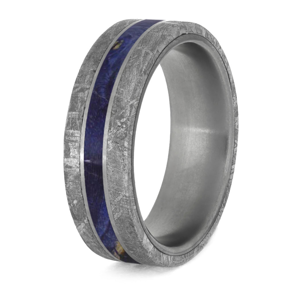 Blue box elder burl wood separates the Gibeon meteorite edges in this authentic wedding band. Titanium is finished to be in a sleek matte finish, perfectly matching the blue tones in the wood.
