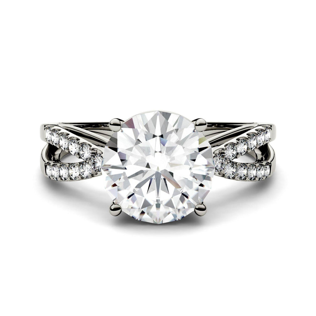 Handcrafted to perfection, this 14k white gold moissanite engagement ring boasts a 9.0mm (2.92ct) Moissanite by Charles & Colvard round cut stone. Additional accent stones drift down the side of this split shank style ring.