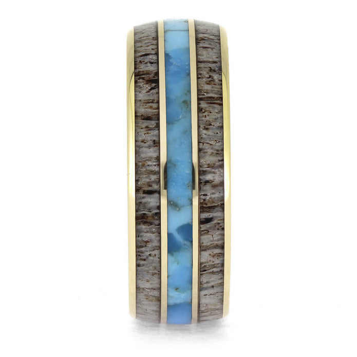 Wear an exceptional combination of natural materials with this deer antler and turquoise wedding band. This masculine ring features a hand-picked Kingman turquoise inlay alongside naturally-shed deer antler, all contained within polished 14k yellow gold.